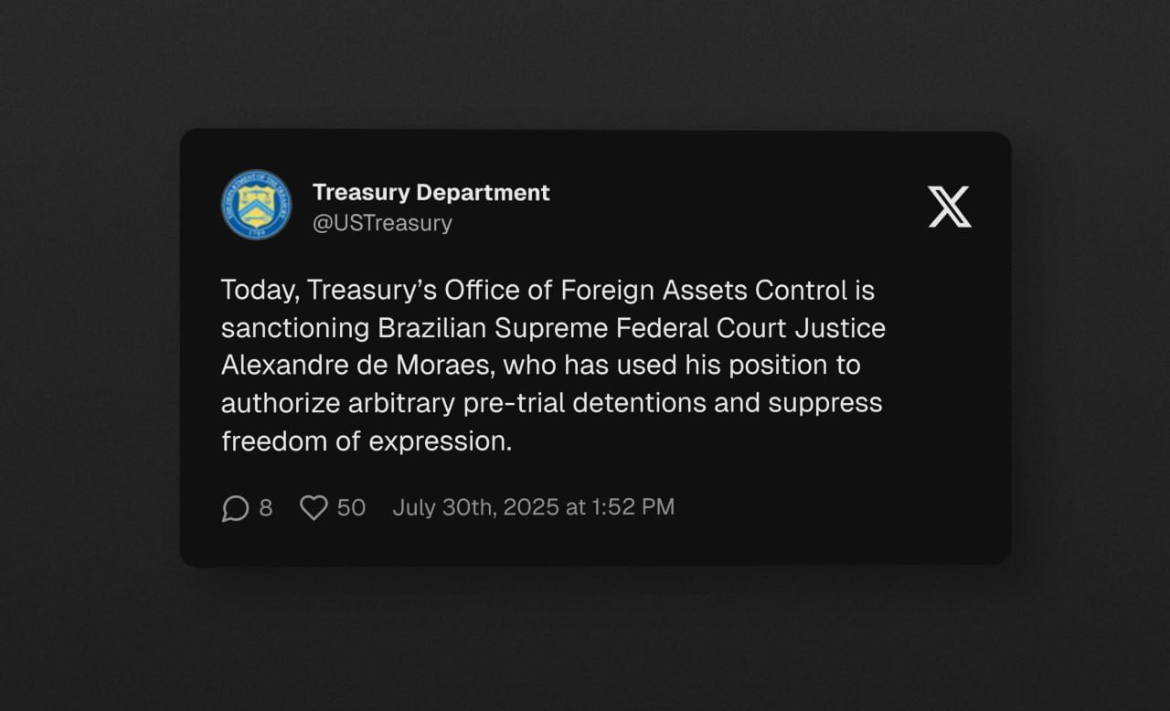 President Donald J. Trump and the US Treasury Department have sanctioned Brazilian Supreme Court Justice Alexandre de Moraes under the Global Magnitsky sanctions program for serious human rights abuses.