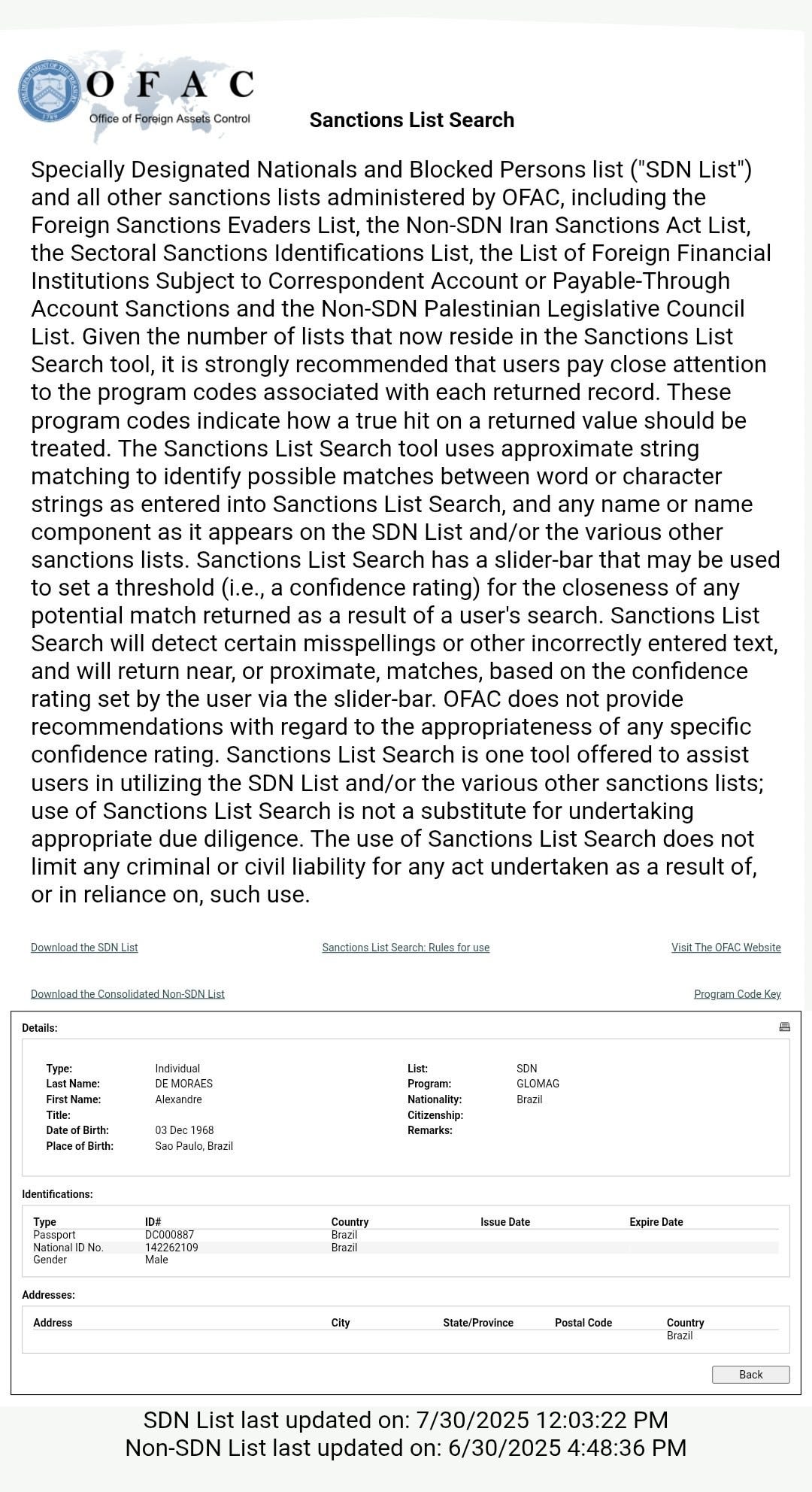 Brazilian Supreme Federal Court Justice Alexandre de Moraes appears on the Office of Foreign Assets Control (OFAC) of the United States of America!