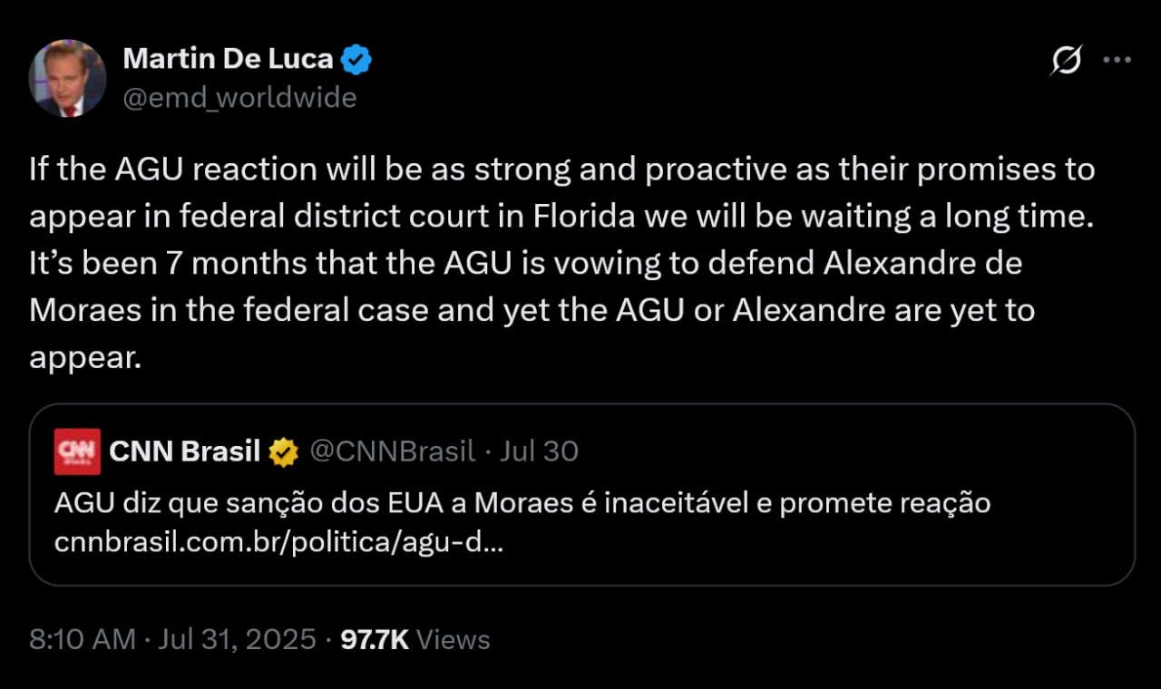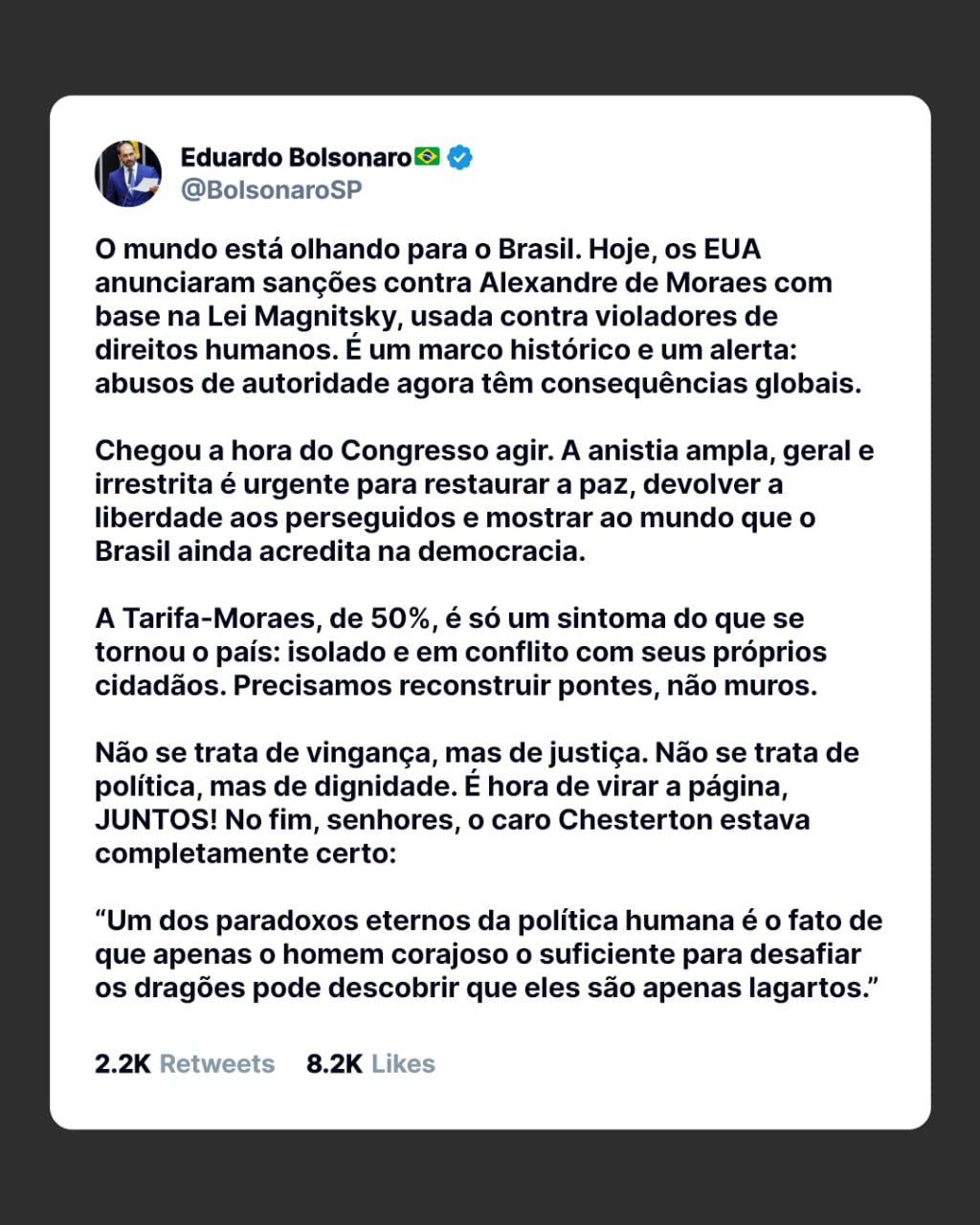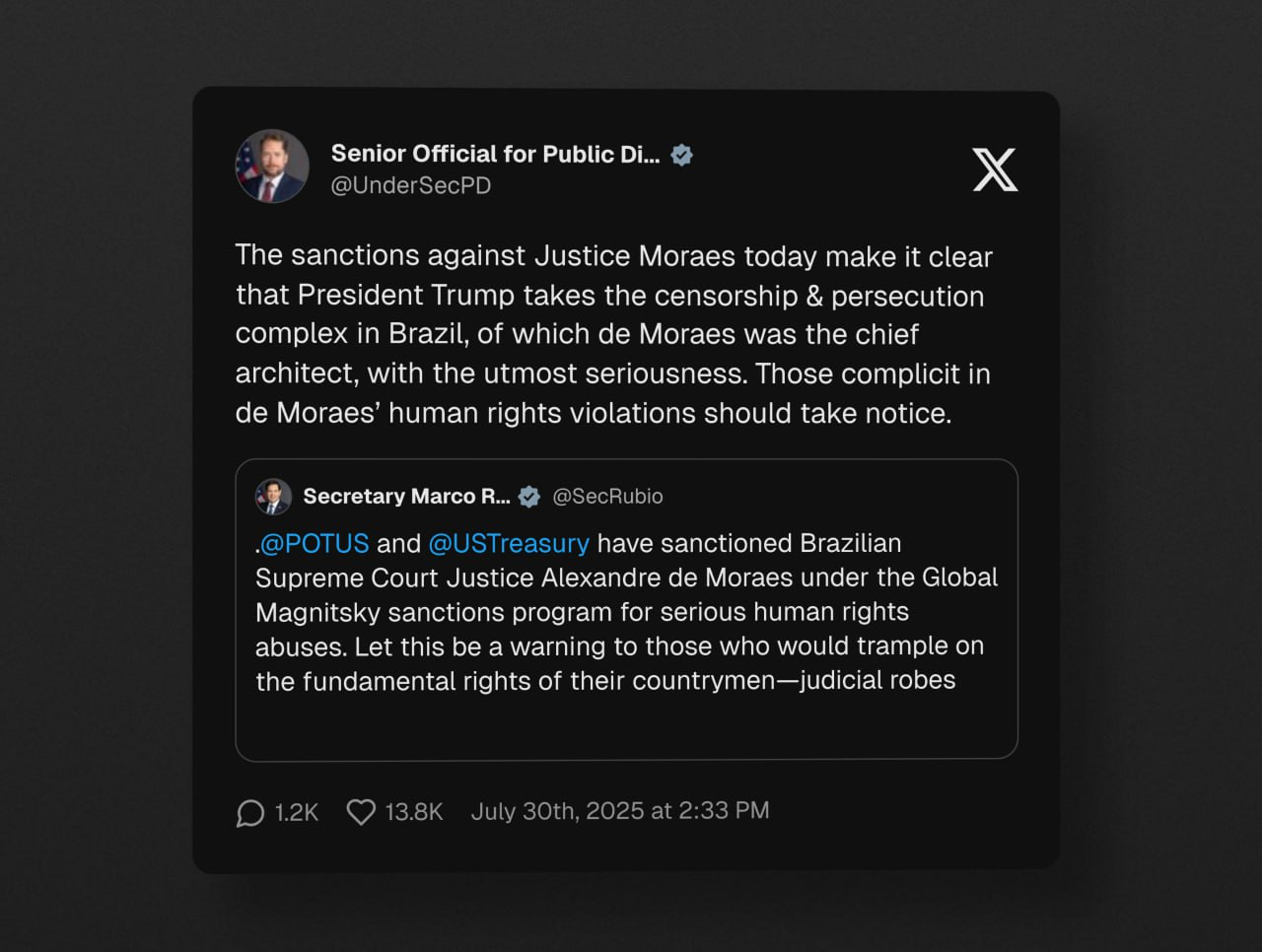 "The world is watching Brazil. Today, the U.S. announced sanctions against Alexandre de Moraes under the Magnitsky Act, used against human rights violators. This is a historic milestone and a warning: abuse of power now has global consequences.