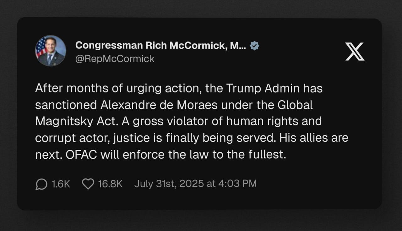 U.S. Representative Rich McCormick, a member of the Republican Party, stated that allies of Supreme Federal Court (STF) Justice Alexandre de Moraes should be the next to face sanctions from the Donald Trump administration.