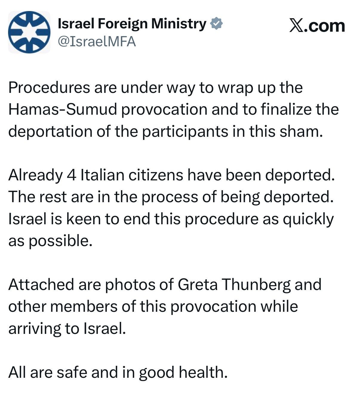 Israel has already deported 4 members of Greta’s flotilla and are actively working on deporting the rest.