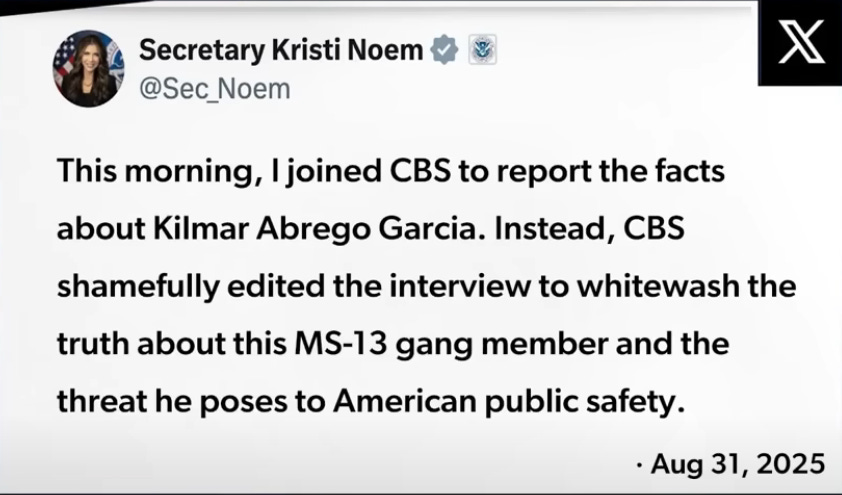 CBS News, once again, edited its interview with Homeland Security Secretary Kristi Noem, removing a section in which she explained why the Trump administration wants to remove the so-called "Maryland Man" Kilmar Albrego Garcia.