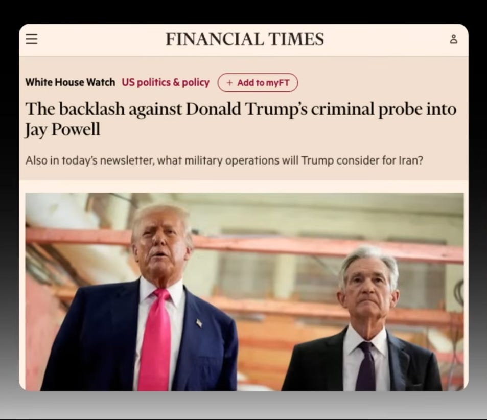 “The risk of a financial crisis if the world loses confidence in U.S. institutions is rising enormously more since the Department of Justice’s decision this week to bring a criminal case against the chairman of the Federal Reserve.”