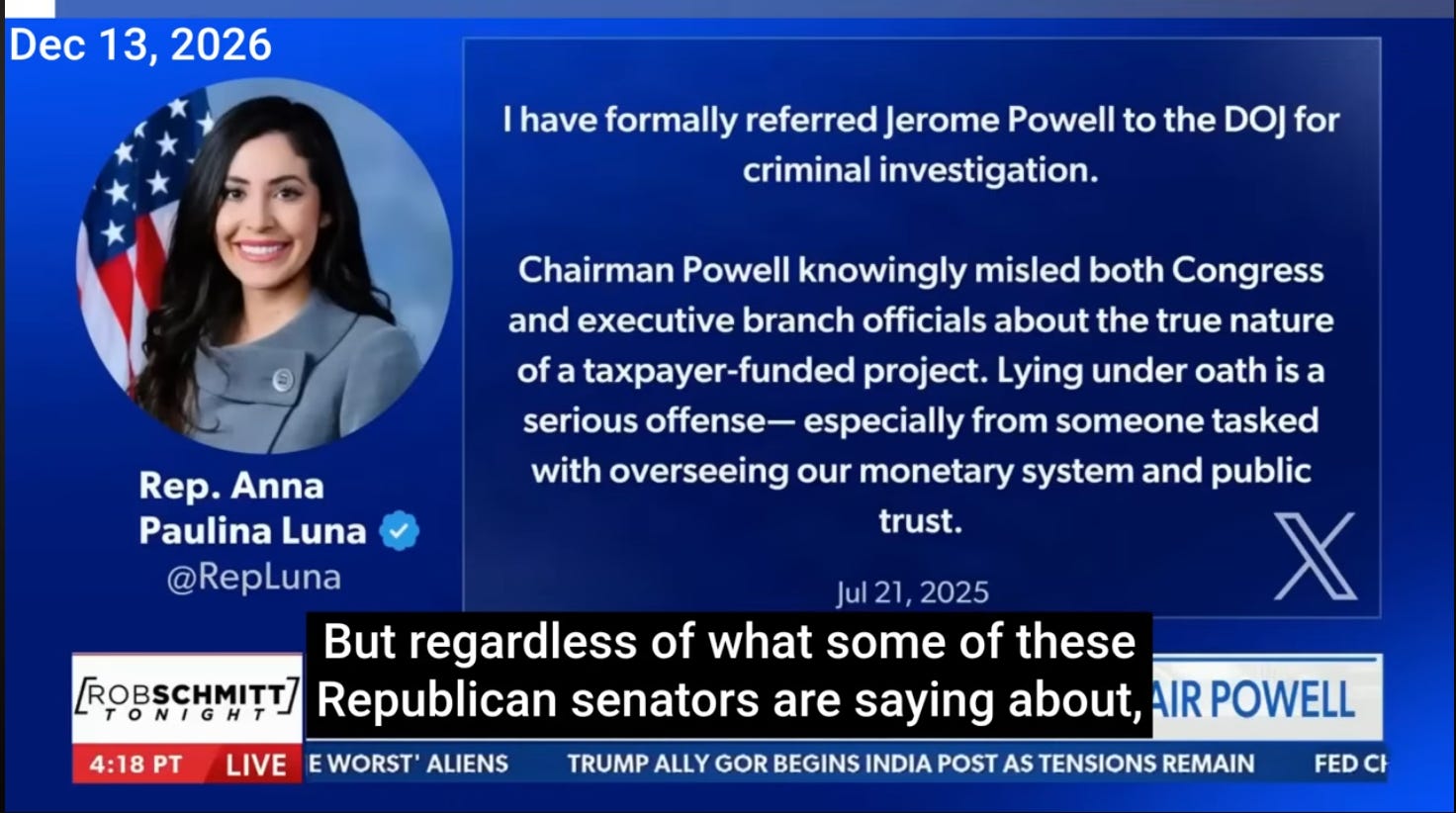 Powell’s subpoena came from a criminal referral from Congressman Anna Paulina Luna, not Donald Trump.