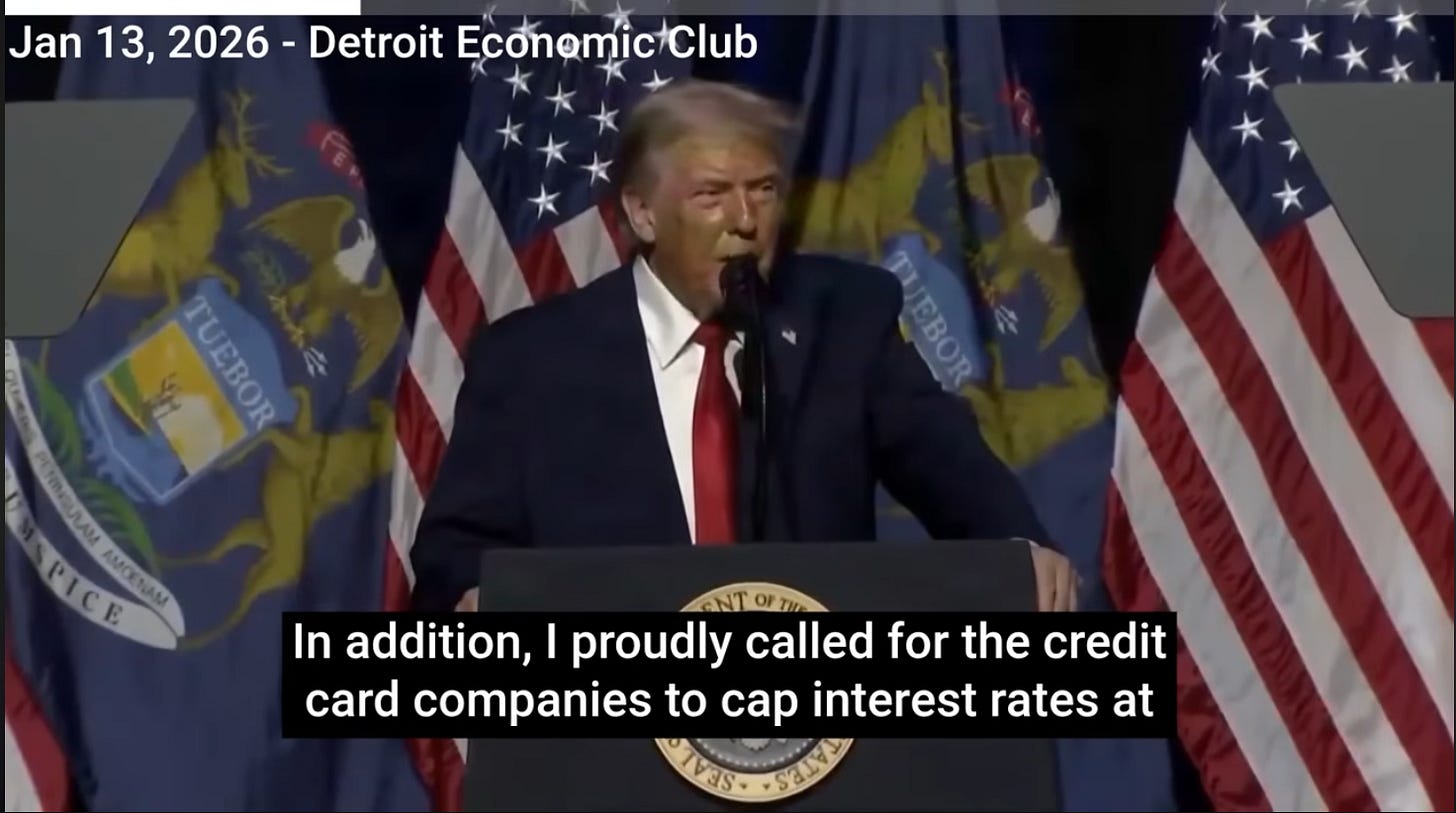 “In addition, I proudly called for the credit card companies to cap interest rates at 10% for one year because they’re getting 28 and 30% and 32%; and it’s unfair, the rates are way too high.”