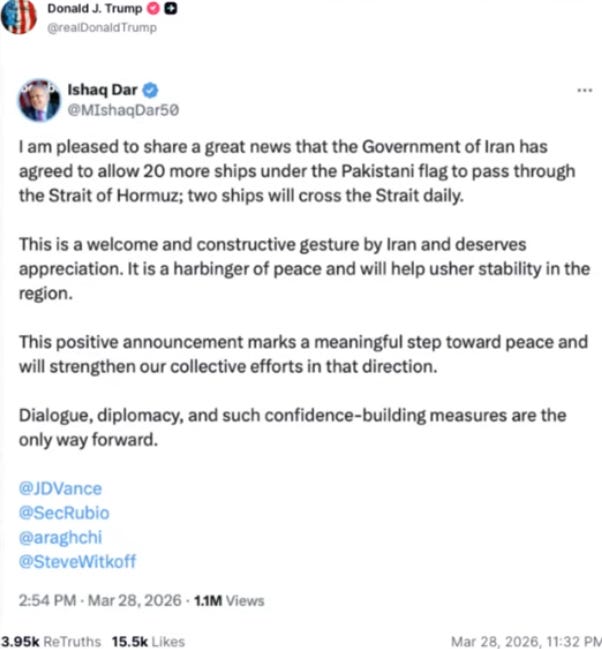 And when Pakistan’s foreign minister announced that Iran had agreed to allow 20 more Pakistani-flagged ships through the Strait of Hormuz, he addressed his statement on X directly to J.D. Vance, Marco Rubio, and Steve Witkoff.