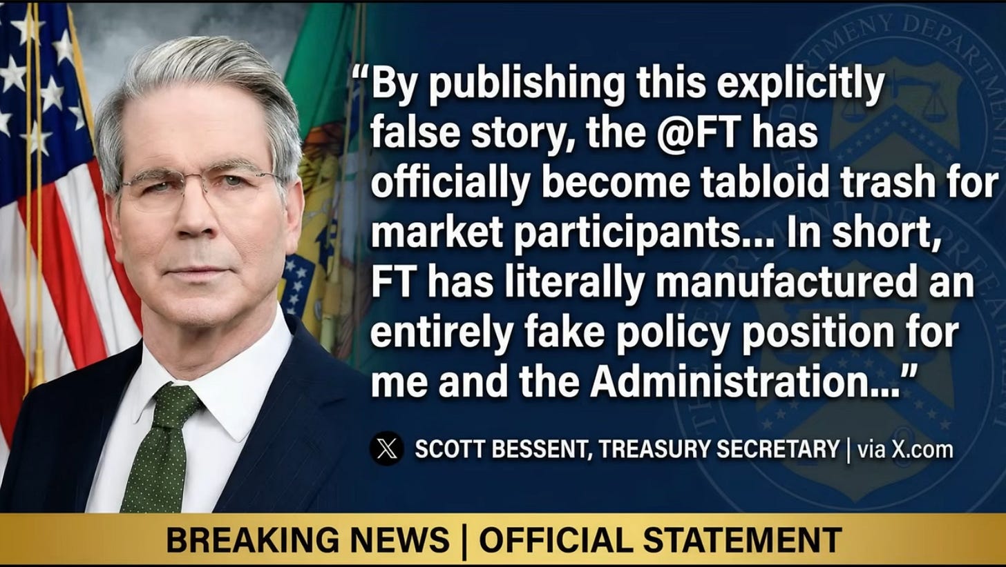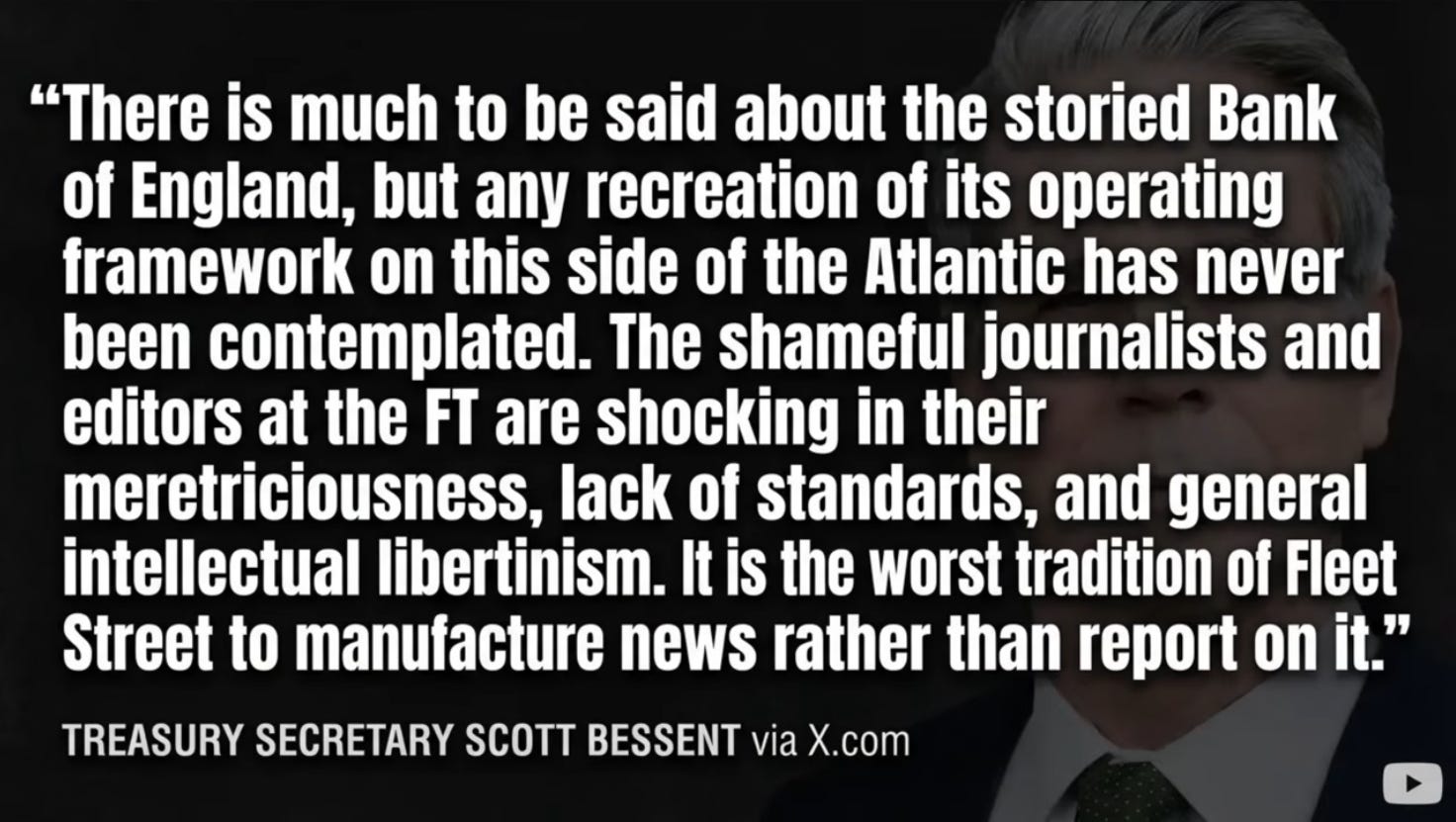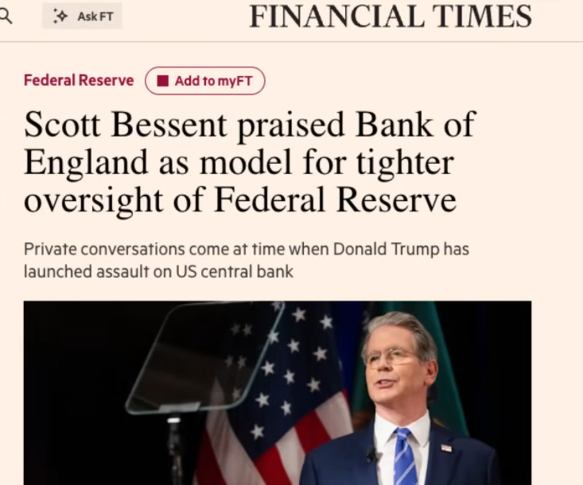 The FT published a story claiming Bessent had praised the Bank of England as a model for restructuring the Federal Reserve.