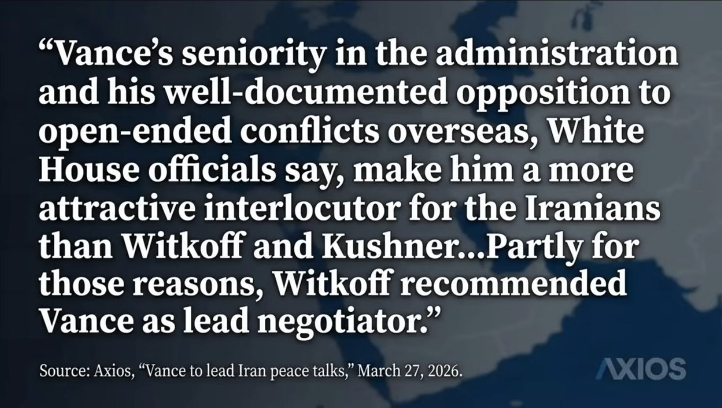 President Trump confirmed that Vice President Vance will be the lead negotiator for the U.S., and the well-sourced Barack Ravid at Axios gave that background, says,