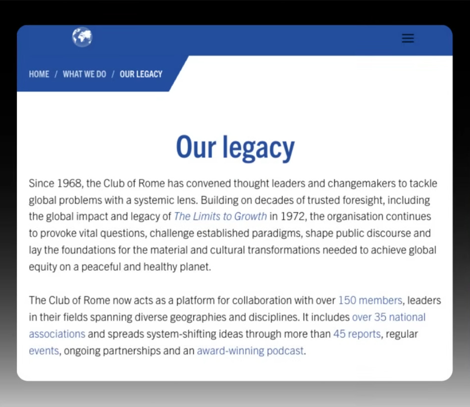 The Club of Rome publishes reports such as “The Limits to Growth” to highlight the unsustainability of global demographic and economic trends and to advocate for solutions to humanity’s challenges.