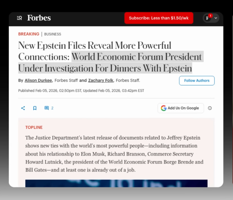 Forbes reports that his relationship with Epstein has led to an internal investigation and a possible fight for control of the World Economic Forum with its founder, Klaus Schwab.