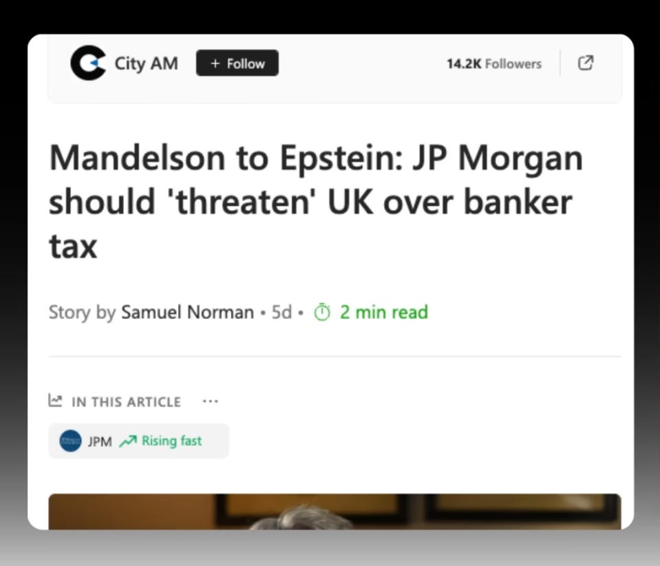 To recap, the recent Epstein release shows Mandelson trading deep insider financial information with Epstein from 10 Downing Street during the 2008 financial collapse.