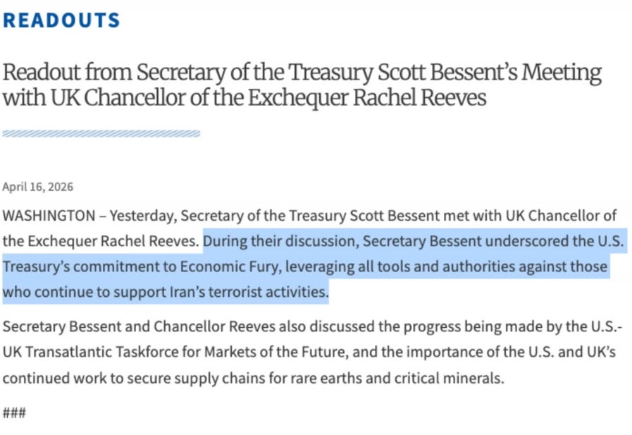 Susan cites Treasury Secretary Scott Bessent’s April 16 meeting with UK Chancellor Rachel Reeves, highlighting the on-record “Economic Fury” campaign and U.S. tracking of financial flows to Iran that allegedly lead to London.