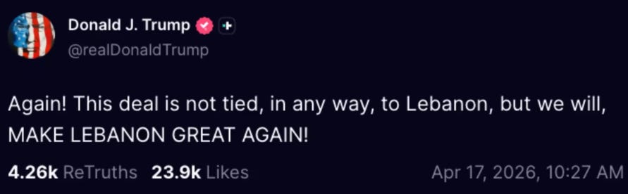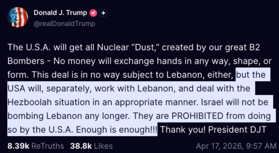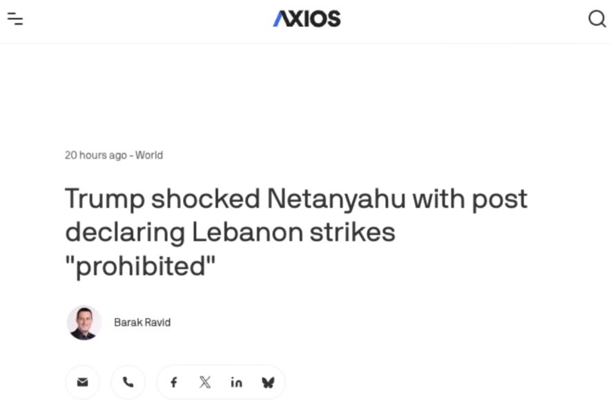Trump shocked Netanyahu with posts declaring Lebanon strikes prohibited (still thinking Trump reports to Netanyahu?)
