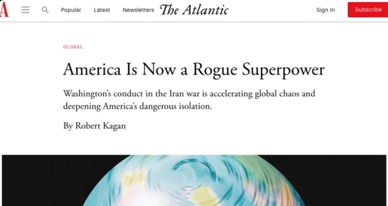 And the establishment’s Atlantic Magazine put it in their own terms with this headline, America is now a rogue superpower.