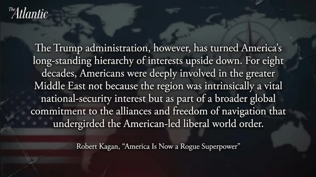 neocon architect Robert Kagan inadvertently confessed in The Atlantic that eighty years of American wars in the Middle East were never about our security - they were about enforcing the "liberal world order" - and where Trump's questioning of NATO membership is cracking the imperial architecture wide open.