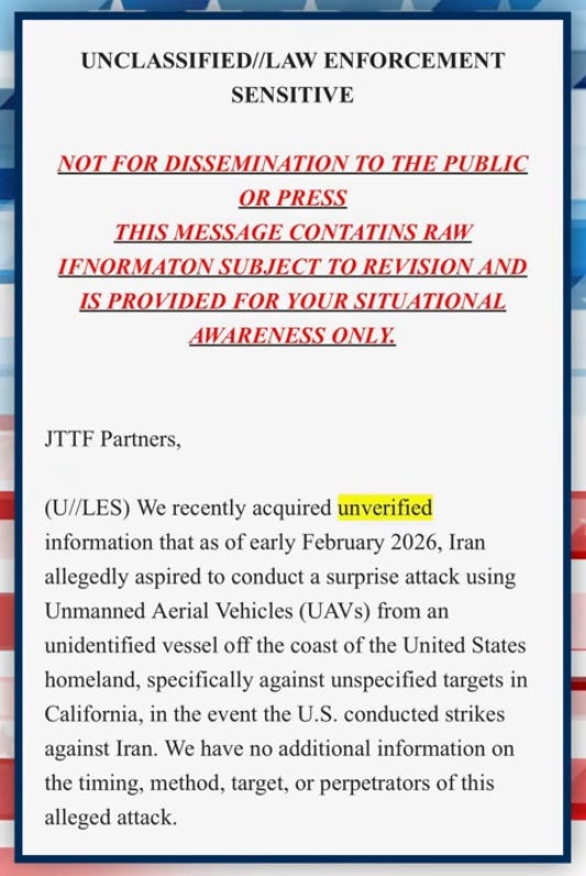 Federal authorities warned California law enforcement that Iran reportedly aspired to launch a surprise drone attack against targets in the state from a vessel at sea.