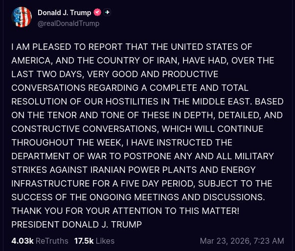 Donald Trump says he has instructed the US military to postpone "all military strikes against Iranian power plants and energy infrastructure" following two days of "very good and productive conversations" with Iran.