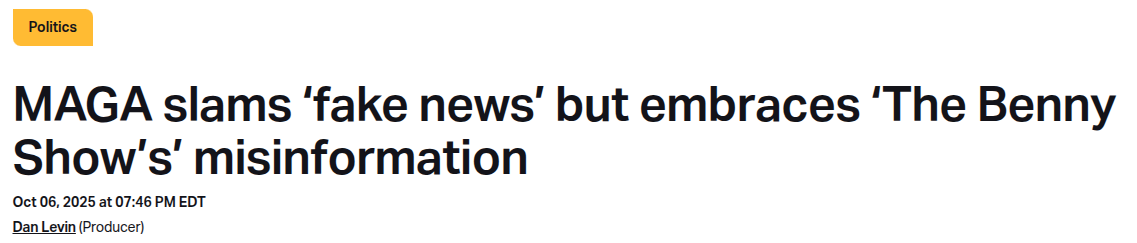 Yahoo/Daily Beast - Pro-Trump YouTuber Benny Johnson claims “I Went on an ICE Raid and Arrested Illegals in Chicago” even as his video shows him doing no such thing. Our note: their video is HIGHLY edited, apparently the daily Beast could not be bothered with a video more than 9 minutes long where the filming of raids can be seen; full video available here. [link | archive] 6 October 2025