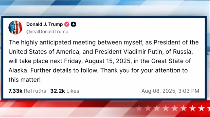 The highly anticipated meeting between Trump and Putin is to take place on Friday, 15 Aug 2025 - our observation is that Alaska is a large hunting ground, perhaps Trump Jr will be going on a hunting trip with Putin? THAT would send the MSM into a tizzy, accompanied by a downward spiral…