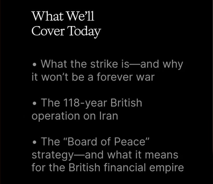 What Trump just hit is the last stronghold of a British operation that has controlled Iran’s destiny since 1908, the year British Petroleum seized its first oil well on Iranian soil.