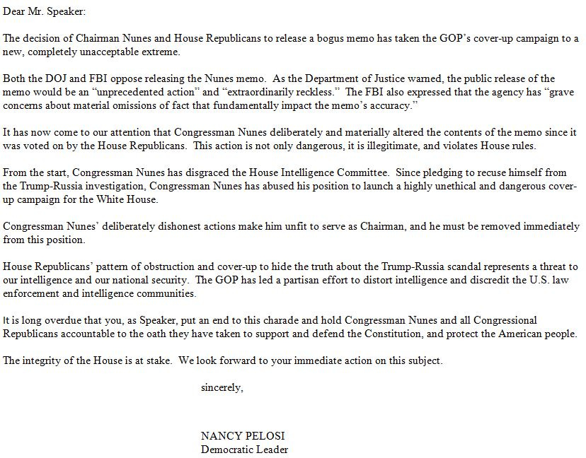 Minority Leader Pelosi called on Speaker Ryan to remove Devin Nunes as chair of the House Intel Committee…
