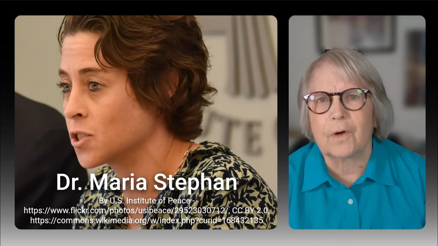 Benz starts his deep dive with a January 22nd inflammatory appearance of Dr. Maria Stephan on Stephen Colbert’s late-night show.