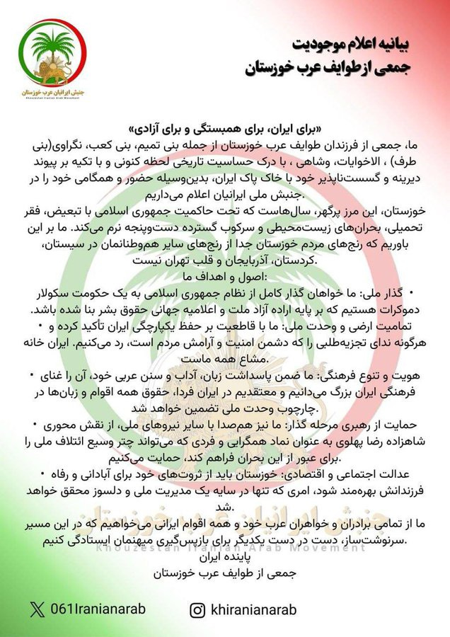 We, the assembly, descendants of the Arab tribes of Khuzestan (Bani Kaab, Bani Tamim, Bani Lam, and others), with historical awareness of the present moment and looking upon the pure land of Iran, our homeland, and with the presence and religion of our ancestors, declare... our loyalty and commitment to the side of the pure land of Iran.