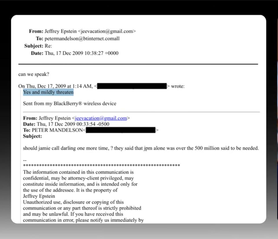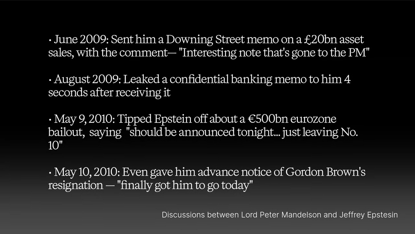 Mandelson wasn’t just socializing with Epstein; he was a top-level policy operative embedded in the British government, and the new files show devastating evidence that, in 2009 and 2010, right in the middle of the financial crisis, Mandelson leaked highly sensitive government information to Jeffrey Epstein.