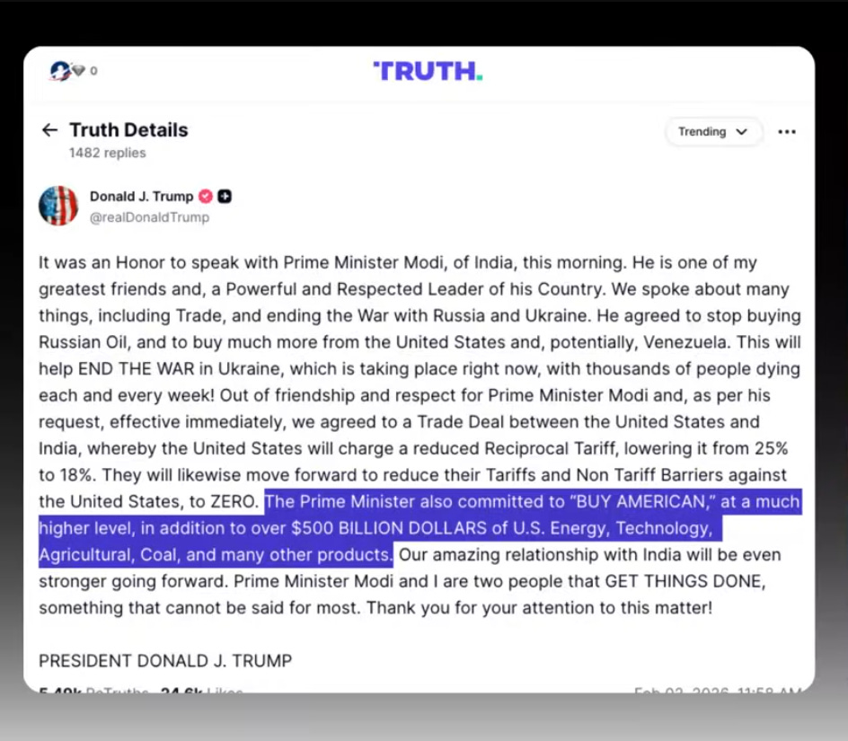 In addition to reducing tariffs on both sides, including bringing US exports to India down to zero, the deal announced a major purchase of American goods by India.