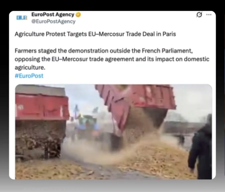 Tens, if not hundreds of thousands of farmers are demonstrating in Brussels, Paris, Ireland, and elsewhere because that deal will bring cheap South American products into Europe and wipe out what is left of their farmers.