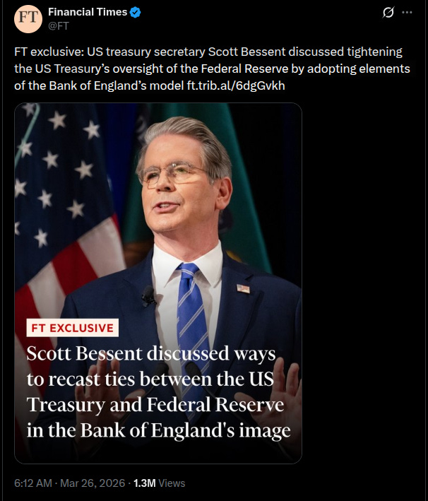 Despite my direct, on-the-record denial of ever having advocated, explored, or espoused the idea that the Chancellor-Bank of England statute serves as a prototype for a Treasury-Federal Reserve relationship, FT journalists manufactured a story with the headline, “Scott Bessent praised Bank of England as model for tighter oversight of the Federal Reserve.”