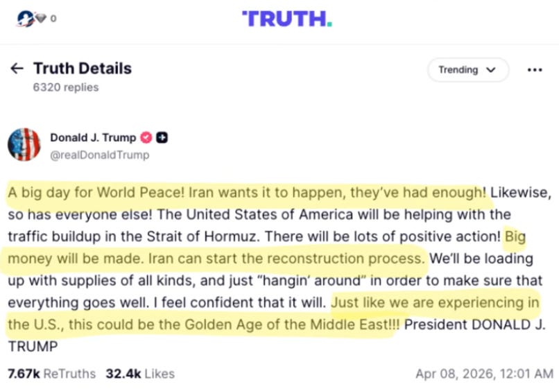 And then Trump did something extraordinary - he posted Iran’s own official statement confirming the ceasefire and the opening of the strait.