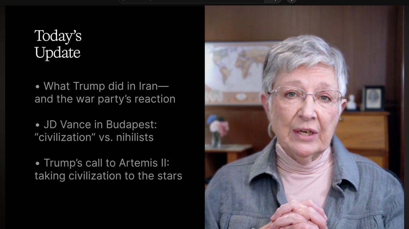 She connects this to Vance’s Budapest remarks with Viktor Orbán about defending Western civilization against “nihilists,” and to Trump’s call with the Artemis II crew about establishing a permanent presence on the Moon and pushing on to Mars.