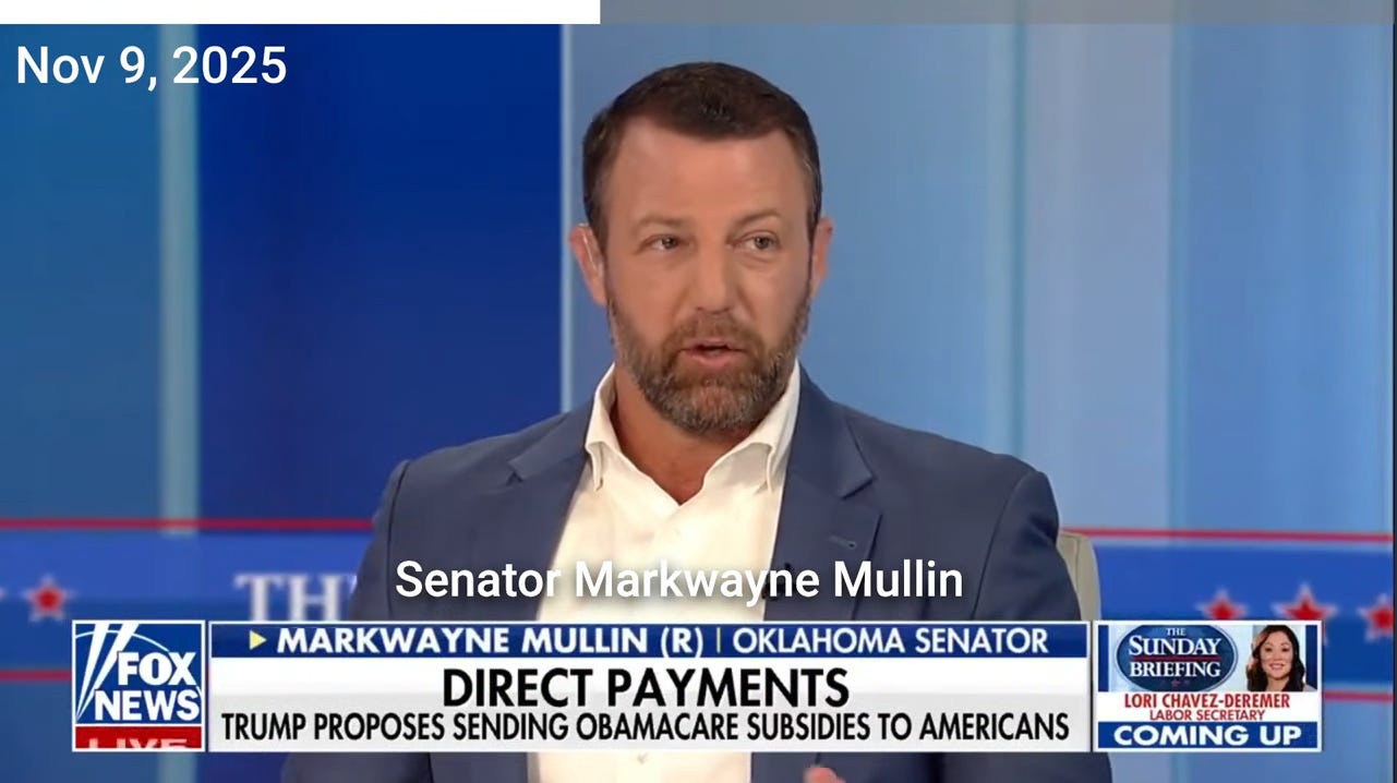 The discussion includes Senator Markwayne Mullin’s support for Trump’s idea to redirect Obamacare subsidies directly to the public, highlighting the failure of the Affordable Care Act.