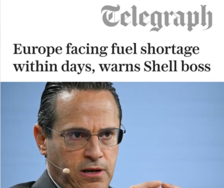 That’s a statement of physical fact, which even the Telegraph admitted with the headline, Europe facing fuel shortage within days, warns Shell boss.