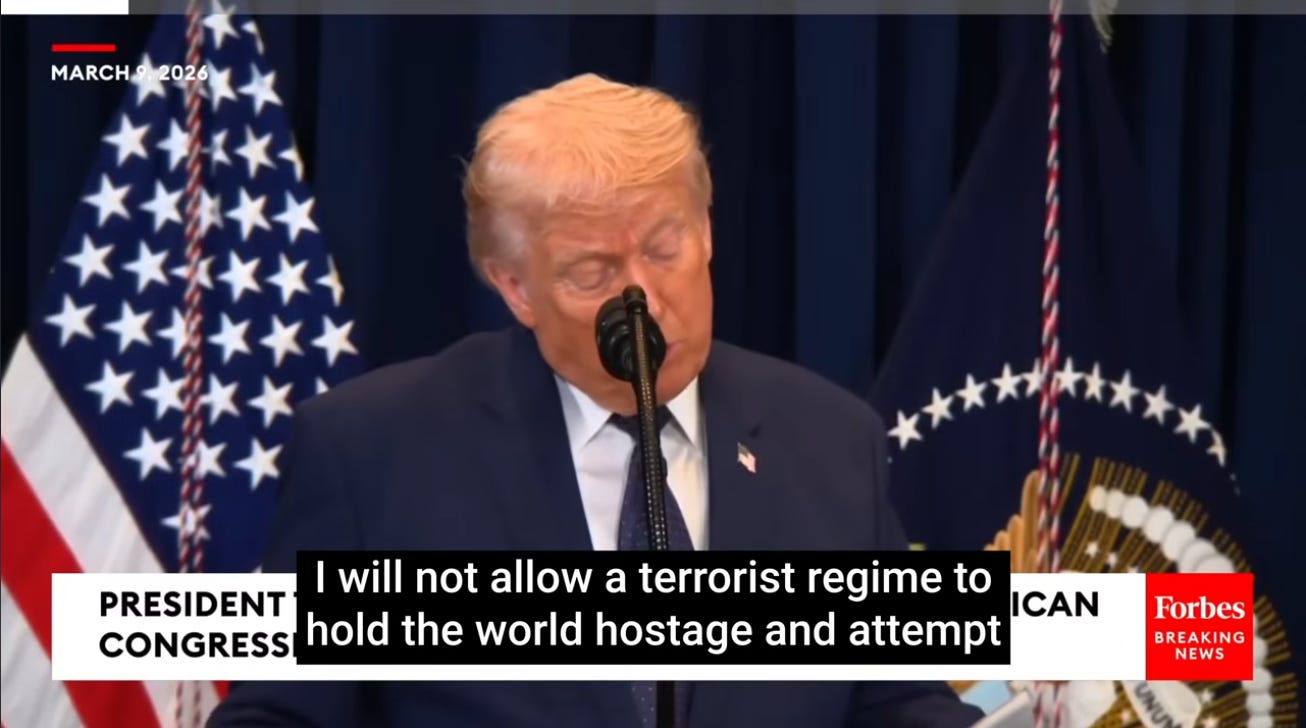 “I will not allow a terrorist regime to hold the world hostage and attempt to stop the globe’s oil supply, and if Iran does anything to do that, they’ll get hit at a much, much harder level.