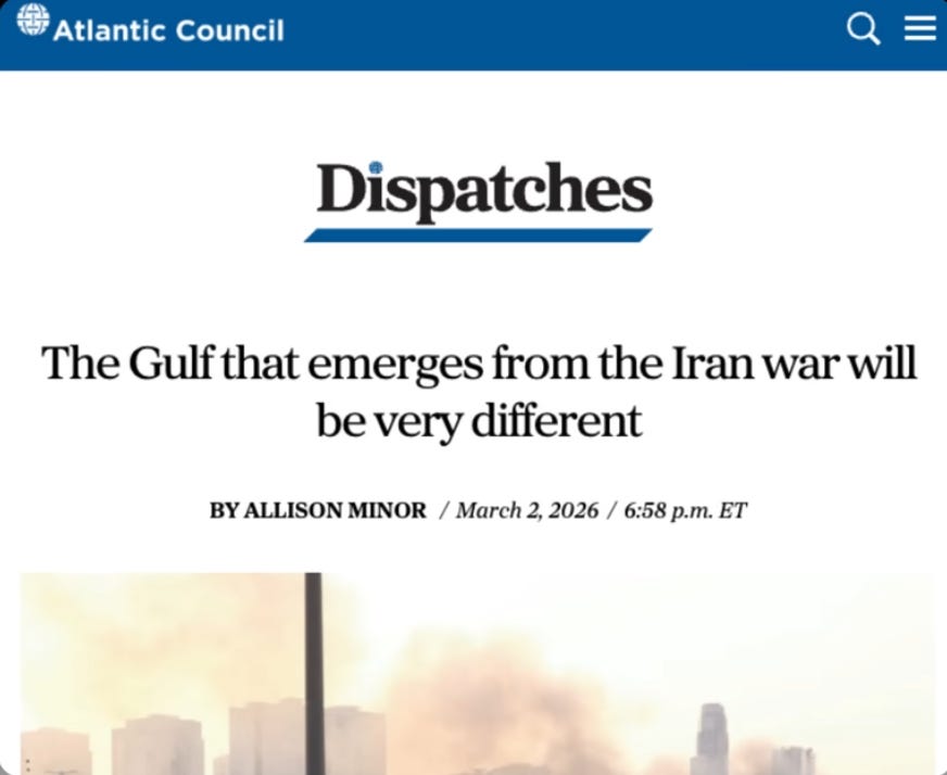 Even globalist institutions like the Atlantic Council recognized the dramatic shift underway with a March 2nd headline that read, the gulf that emerges from the Iran war will be very different.