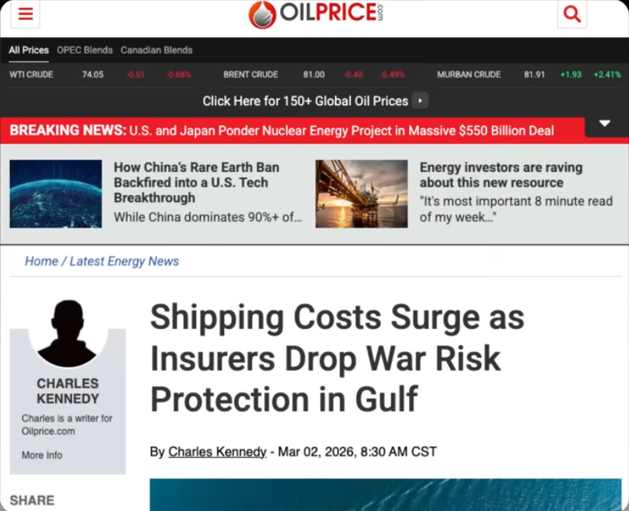 On Monday, March 2nd, leading ship insurers, including Lloyds of London, announced they were canceling war risk coverage for the Strait of Hormuz and adjacent waters.