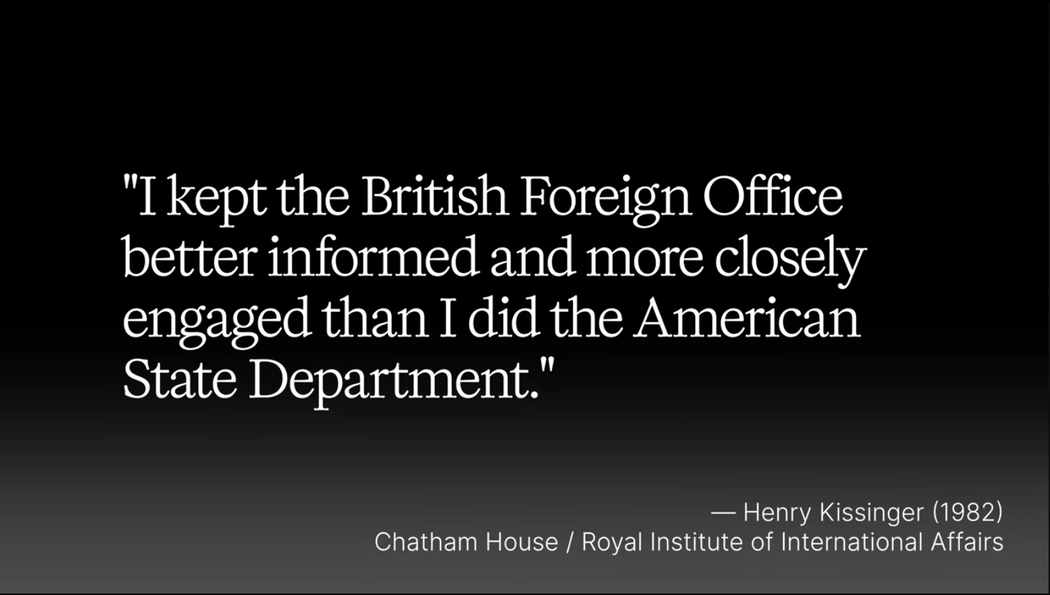 And if you want to know who Kissinger was leaking to, just look at his infamous speech to London’s Chatham House in 1982, when he said ...
