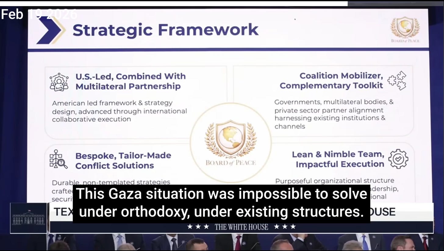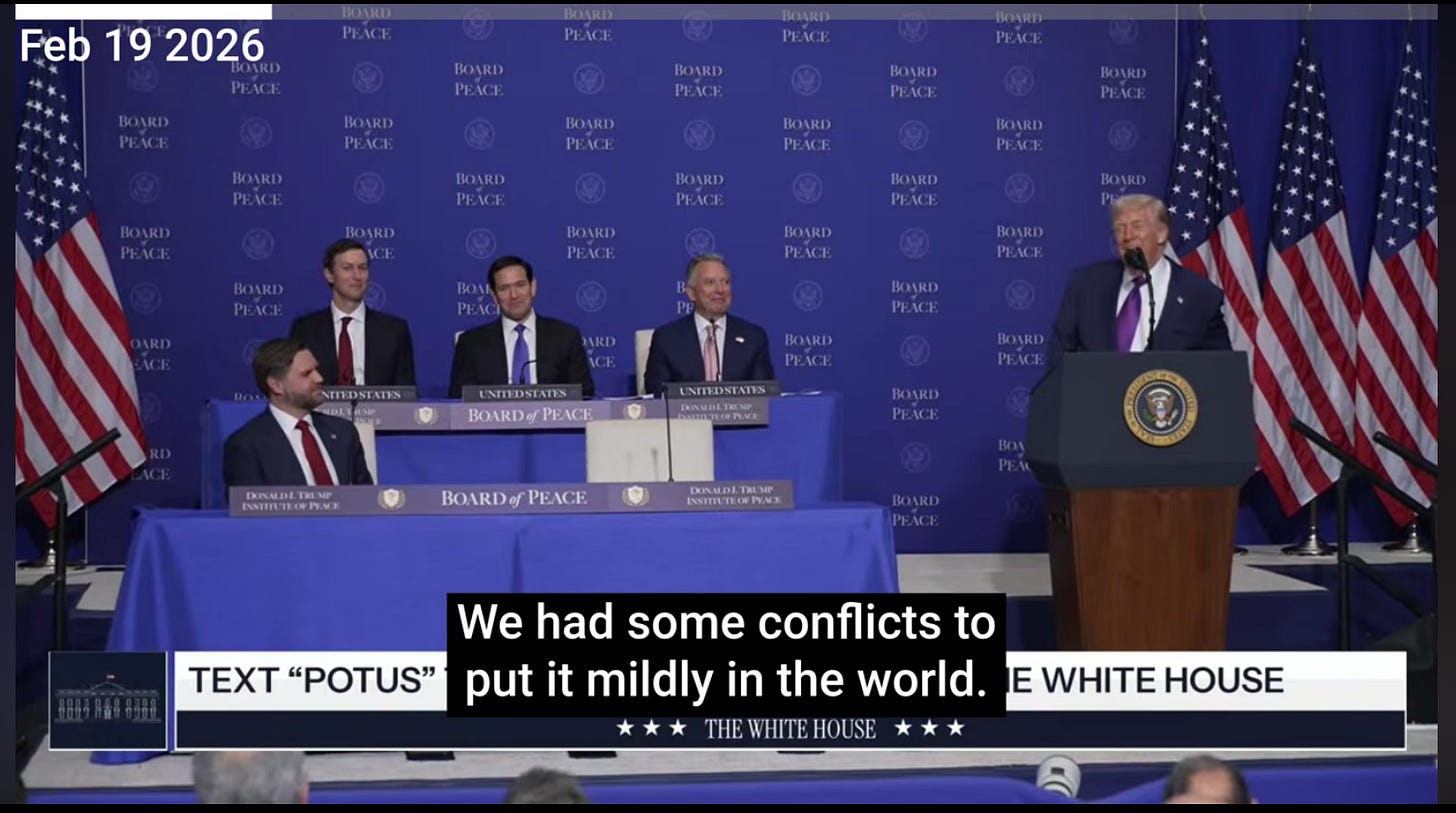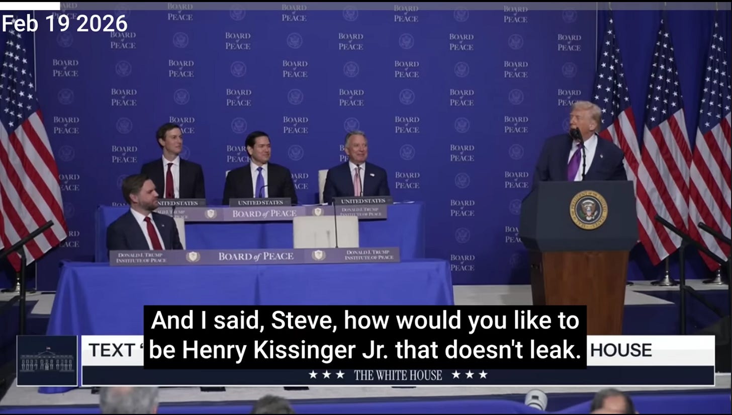 Thursday’s historic Board of Peace meeting (19 Feb 2026), where 60 nations answered President Trump’s call to build something new, and where the president made a not-so-offhand remark about Henry Kissinger.