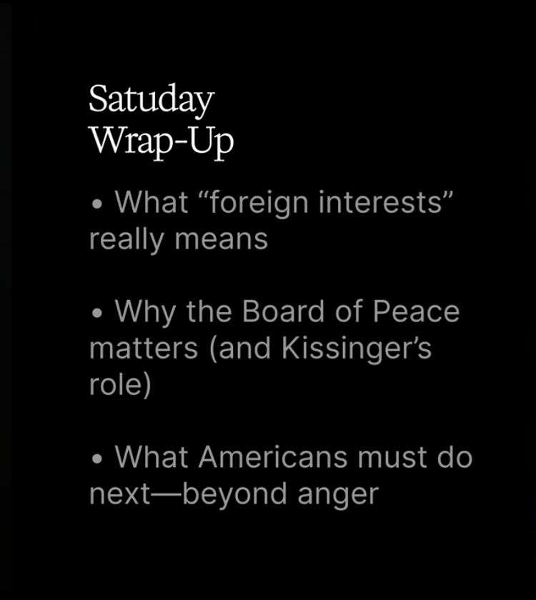 She also contrasts this with Thursday’s Board of Peace meeting, where 60 nations backed “peace through construction,” funding housing, security, and development, rejecting Kissinger-style managed conflict.