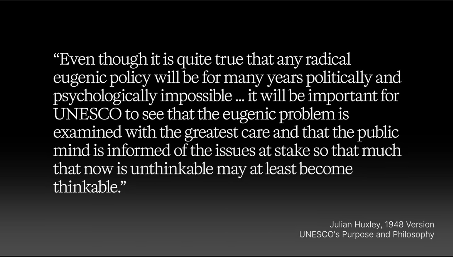 In other words, Huxley is saying Hitler gave eugenics a bad name, and we have to reframe it in the post-war world, and we’re going to use these institutions to do it.