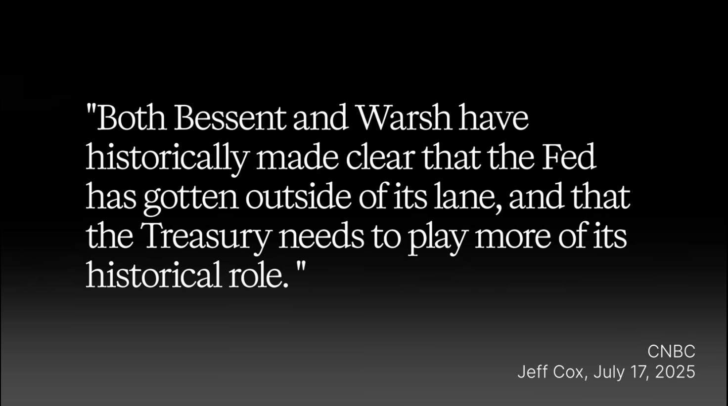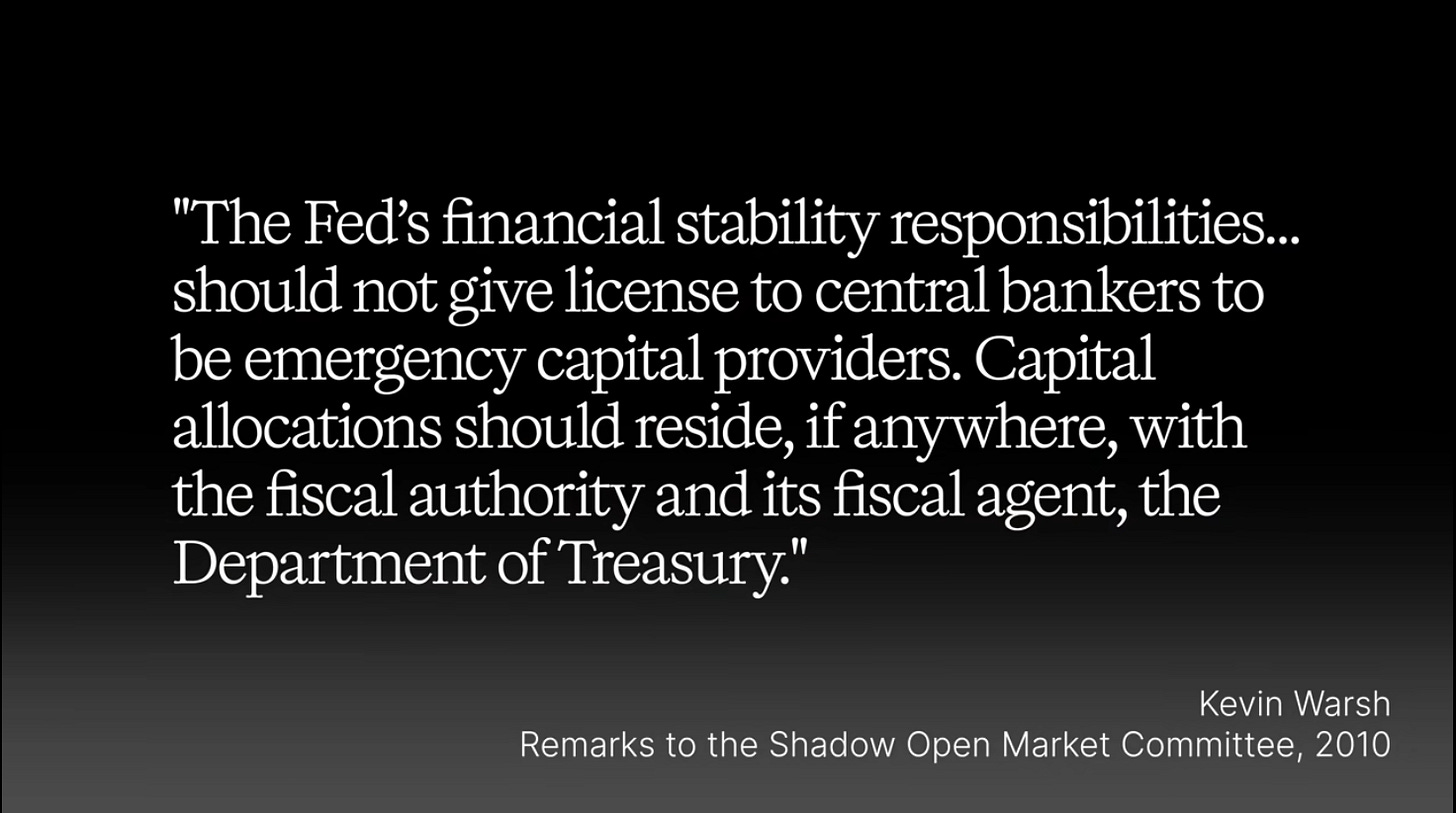 Both Bessent and Warsh have long made clear that the Fed has strayed outside its lane and that the Treasury needs to play a more historical role.