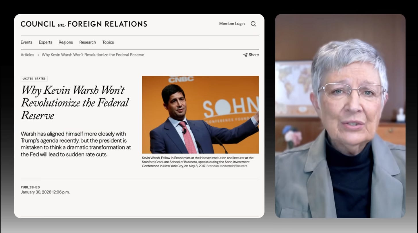 Now you’re going to get a counter narrative from some establishment mouthpieces who are either whistling past the graveyard or hoping to control Warsh, like the Council on Foreign Relations, which consoles itself with this analysis…