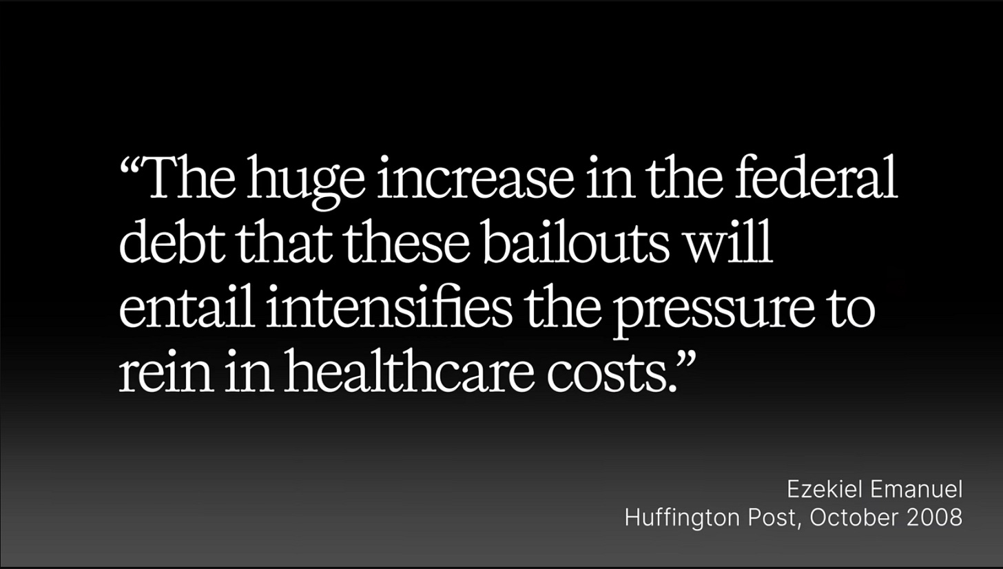 In that same Huffington Post article, Emmanuel described how Americans were panicking over the loss of their income and savings during the financial blowout, and that would convince them to accept a more rationed form of healthcare.