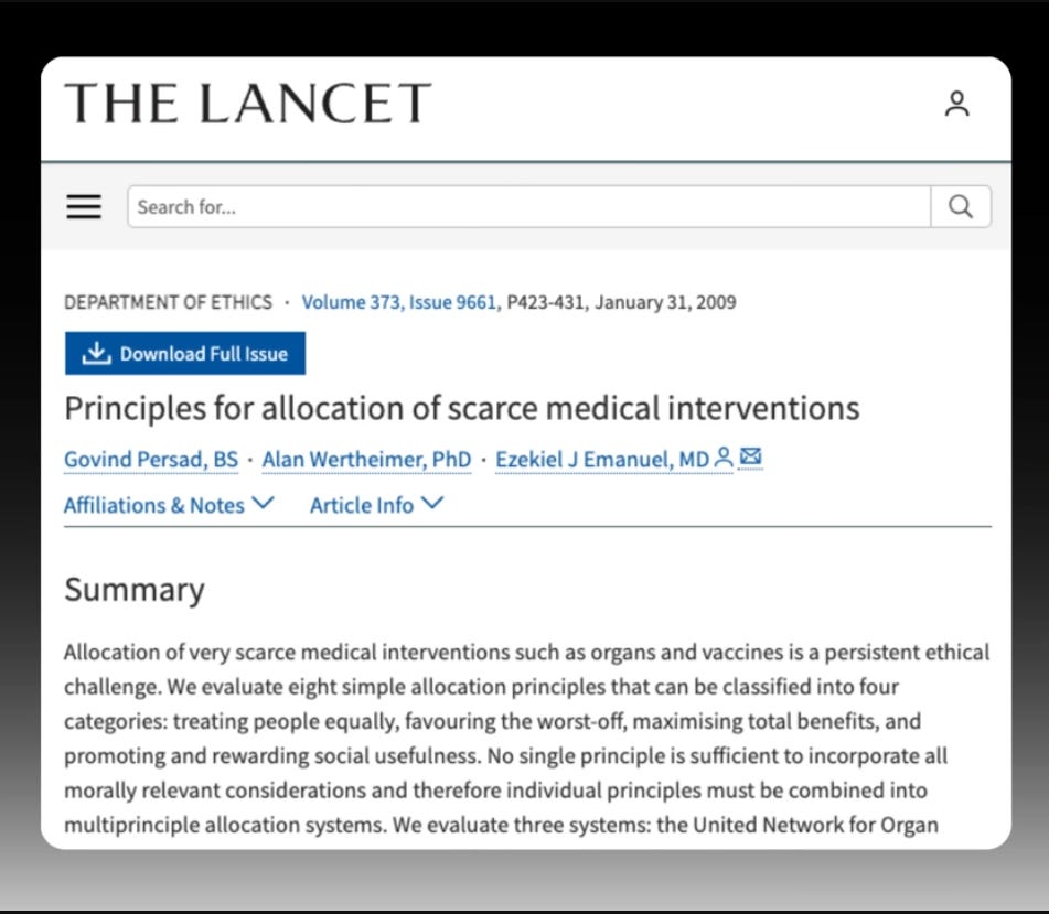 In January 2009, just as Obama was taking office, Emmanuel published his blueprint for a complete life system, arguing that healthcare should be allocated based on your value to society and how much society has invested in you and will still get out of you.