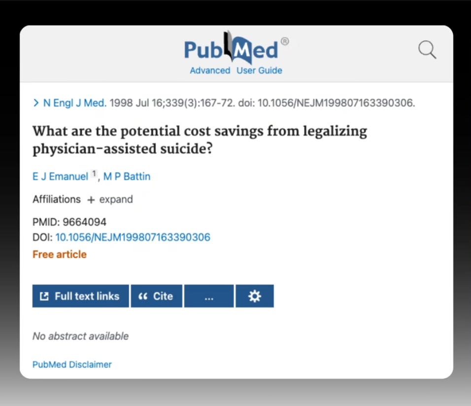Just in case this monetization of human life isn’t clear, look at a paper he authored earlier in 1998 entitled, What are the potential cost savings from legalizing physician-assisted suicide?