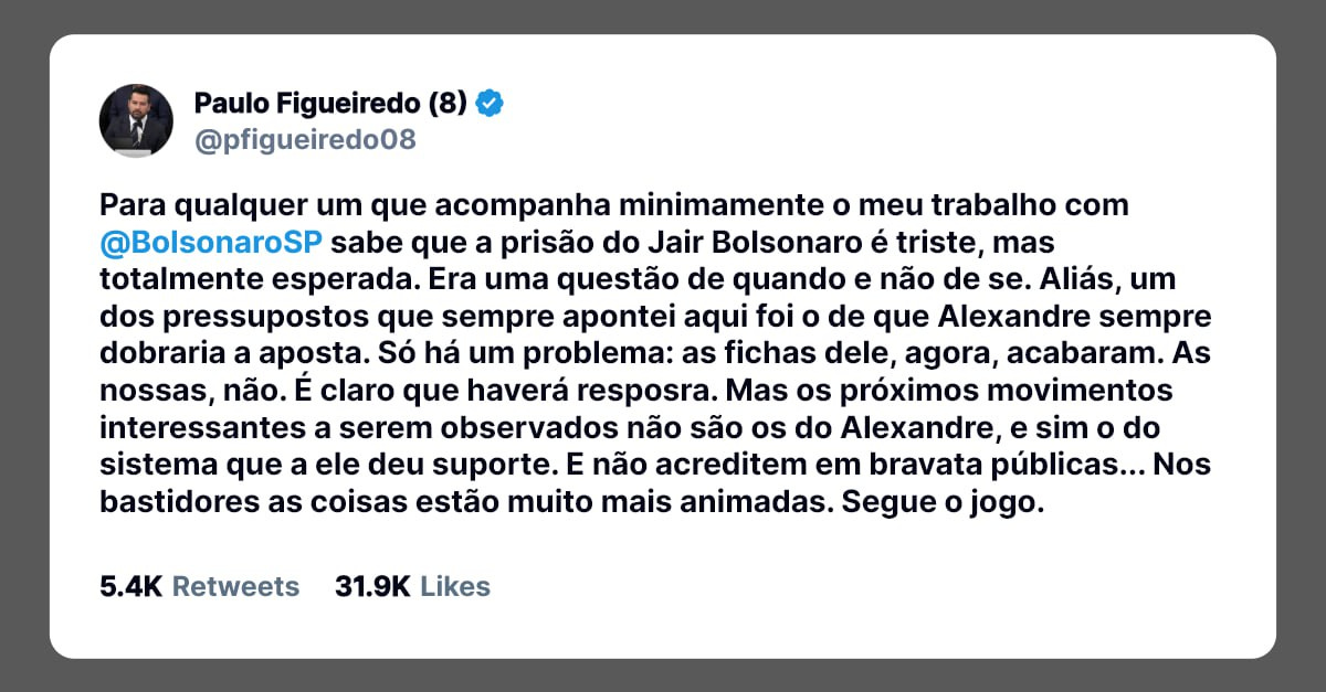“Anyone who has even minimally followed my work with Eduardo Bolsonaro knows that Jair Bolsonaro's arrest is sad, but completely expected.