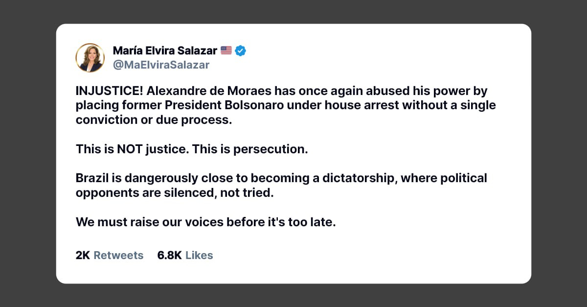 U.S. Congresswoman María Elvira Salazar denounces that Supreme Federal Court (STF) Justice Alexandre de Moraes placed former President Jair Bolsonaro under house arrest without conviction or due process.
