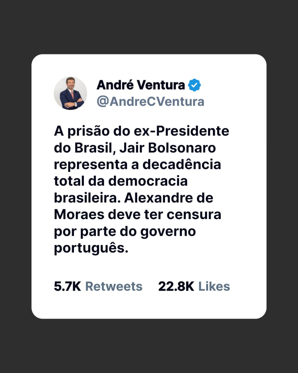 Portuguese MP and leader of the Chega party, André Ventura, reacted to the house arrest of former Brazilian president Jair Bolsonaro, ordered by Supreme Federal Court (STF) Justice Alexandre de Moraes